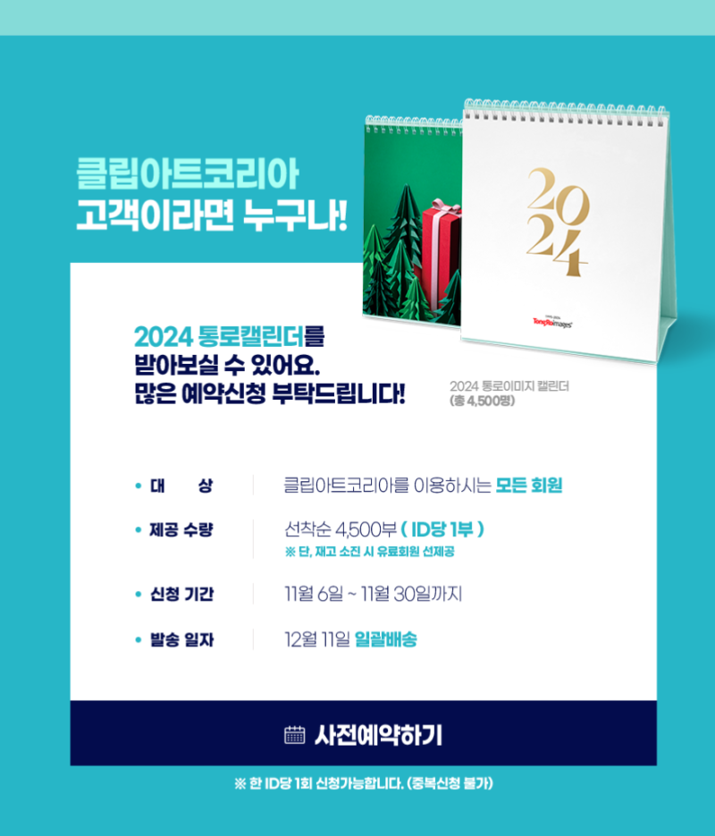 매년 이 시기가 되면 클립아트코리아에서 새해 신년 달력을 무료나눔 해준다. 올해도 마찬가지로 내년 2024년 달력 득템하실 분들의 신청을 받고 있다